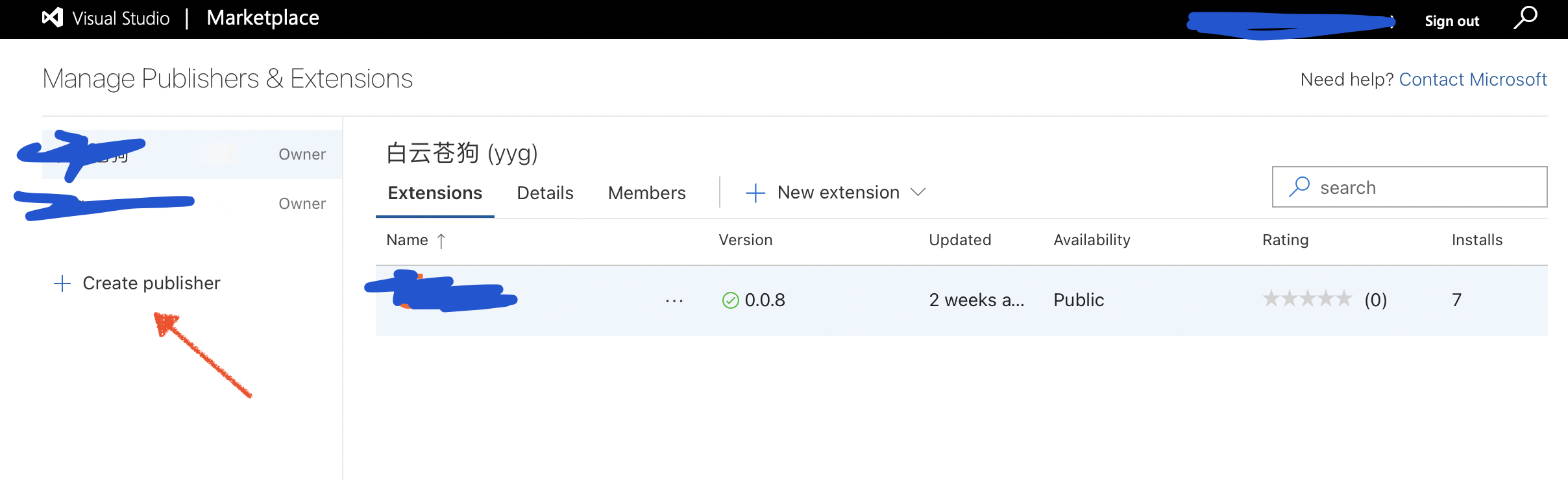 然后需要创建一个 publisher, 以前可以 vsce 直接创建 ,新的不在支持了,只能通过在上一种方式在网页创建了。