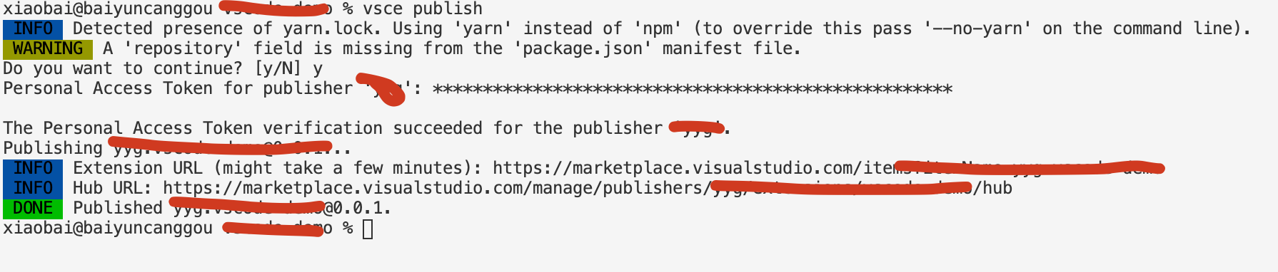 创建好后就可以在使用 vsce publish 命令发布插件,这个时候会提示需要 tonken,将刚刚生成复制上去。可以看到插件已经发布上去了。